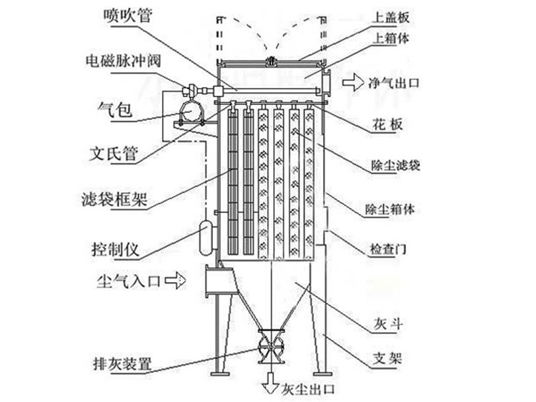 a、除塵器型式:低壓長袋脈沖噴吹,離線清灰;