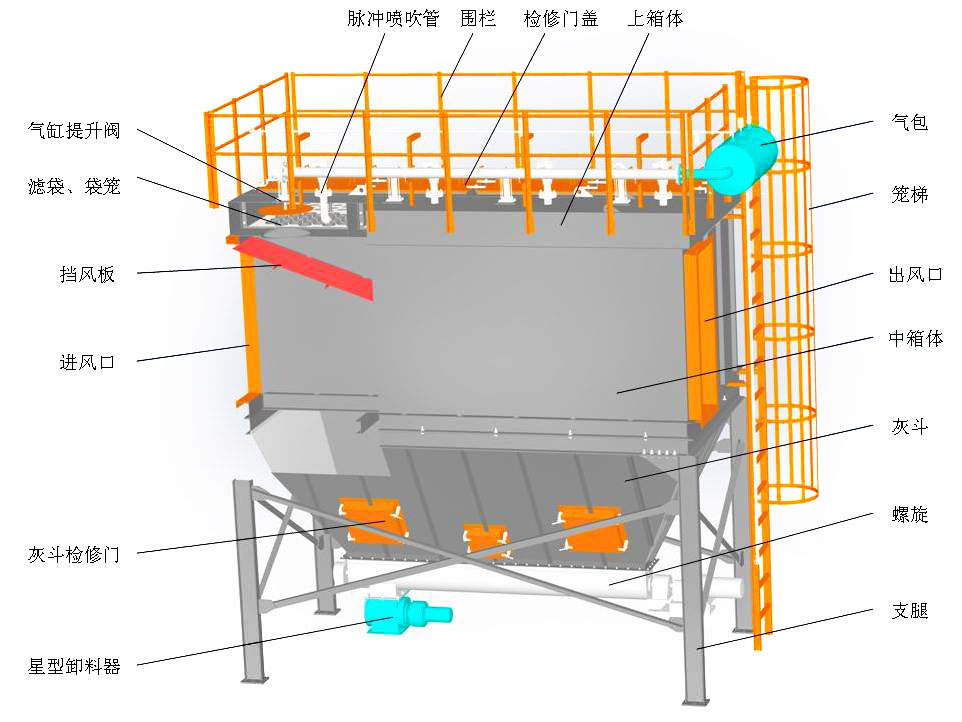 含塵氣體由進氣口進入灰斗、或通過敞開法蘭口進入濾袋室,含塵氣體通過除塵器濾袋過濾為凈化氣體進入凈氣室,再經(jīng)凈氣室排氣口,由風機排走。粉塵積附在濾袋的外表面,且不斷增加,使袋除塵器的阻力不斷上升,為使設備阻力不超過1200Pa,袋除塵器能繼續(xù)工作,需定期濾袋上的粉塵,清灰是由PLC程序定時順序起啟動脈沖閥,使氣包內(nèi)壓縮空氣(0.5-0.7Mpa)由噴吹管噴出(稱一次風)通過文氏管誘導數(shù)倍于一次風的周圍空氣(稱二次風)進入濾袋使濾袋在瞬間膨脹,并伴隨著氣流的反向作用力抖落粉塵,達到清灰的目的。